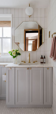 Simplicity, minimalism and functionality came first in this guest bathroom re-modelling. A soft white colour palette that allows for the brass to pop up. For walls, we used white glossy elongated subway tiles laid to vertical stack pattern, and for floor and shower back wall textured white hexagon mosaic tiles. The bespoke vanity unit with a white Evora marble countertop and off-white spray-decorated cupboards offers plenty of storage. Beautifully crafted matt lacquered brass finish shower fittings and brass framed mirror add a sense of luxury and exclusivity to this small contemporary bathroom space. The look is softened by lush indoor plants, natural bamboo roman blinds and weaved plant pots. This scheme just proves that a small bathroom can be stylish, practical and self-efficient.roves that a small bathroom can be stylish, practical and self-efficient.