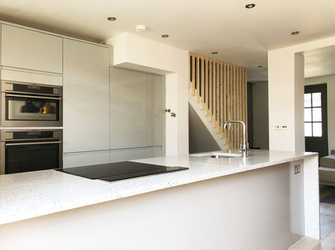 A passion for cooking and entertaining at home led our Clients to undertake a complete remodel of their ground floor. Re-modelling of the existing kitchen and adding a new Pantry – Baking Room resulted in a light and airy open-plan space for entertaining and socializing. We took inspiration from furniture pieces they already had and loved and incorporated them into the new design scheme. One of the main tasks was to create useful storage throughout the house. We remodelled the understairs cupboards, added a new wardrobe in Entrance Hall as well as designed a glazed full-height storage wall in the new Kitchen and fully equipped new Walk-in Pantry - Baking Room. A new pitched roof extension with Crittall style windows and doors floods the spaces with natural light and opens up to south facing garden.
